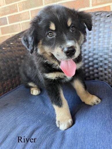 River is an 8 week old Australian Shepherd puppy. He weighs 12 lbs and is a black tri-color. He is sweet boy and loves attention. River loves to play but is a pretty calm puppy so far. Good with other dogs and kids.