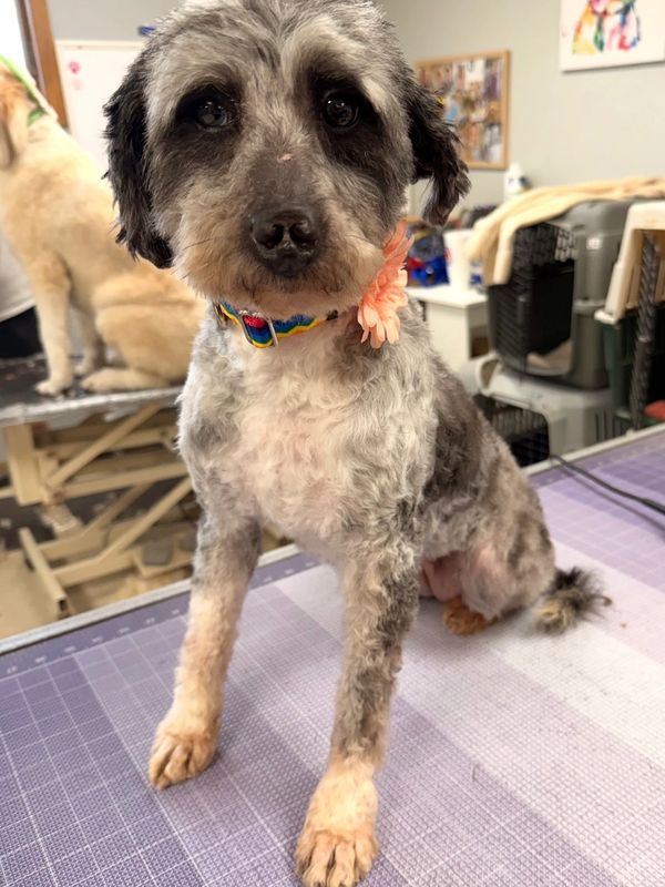 Dr. Roth named her Edna : ) I don't think we've ever had an Edna before and that makes her even more special. She is a Poodle mix and estimated to be four years old. She has a merle coloring and weighs 22 lbs. Edna is good with other dogs and very sweet. She is now spayed, vaccinated, microchipped, and on heartworm/flea prevention.