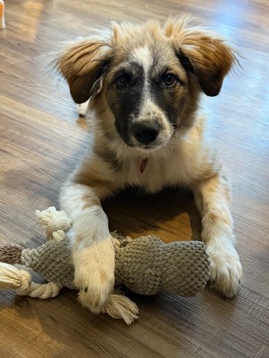 Scarlett is a 4 month old Aussie/Great Pyrenees mix. She weighs 27 lbs and will be a large dog. Her foster mom has been working with her on no jumping, sitting and how to stay. She's doing better on a leash and they are working with her on housetraining. She goes into her crate great and doesn't bark while in there. She is very sweet, playful, and loves her toys. Scarlett gets along with other dogs.