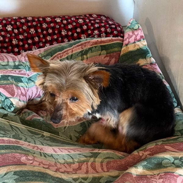 Bitsy is a little Yorkie and she came to us in pretty rough shape. She is estimated at 10-12 years old and weighs 4.4 lbs. She has been getting lots of tlc in foster care and doing so well. She is a sweetie and a quiet girl. Bitsy loves to take naps and sit on laps. She eats well even with no teeth but we use soft foods and small treats. The foster mom is working on housetraining with her. Bitsy gets along with other dogs and likes to sleep in bed with you at night. She does the stairs well but isn't a fan of the leash. She's so tiny that she's easy to carry around.